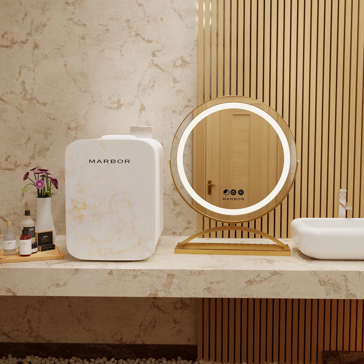 Stijlvol, Functioneel en Uniek! Zoek je een spiegel die niet alleen stijlvol is, maar ook functioneel? Dan is de Marbor make-up spiegel ideaal voor jou! De ideale make-up spiegel met een ingebouwde LED-licht ring met drie verschillende lichtstanden, bedienbaar via touchscreen sensoren. Dit is de perfecte spiegel voor op jouw salontafel, in jouw badkamer of slaapkamer.